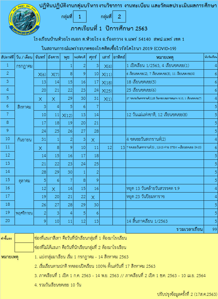 โรงเรียนบ้านห้วยโรงนอก หมู่ที่ 3 ตำบลห้วยโรง อำเภอร้องกวาง จังหวัดแพร่ 54140 สังกัดสำนักงานเขตพื้นที่การศึกษาประถมศึกษาแพร่ เขต 1 สำนักงานคณะกรรมการการศึกษาขั้นพื้นฐาน กระทรวงศึกษาธิการ |